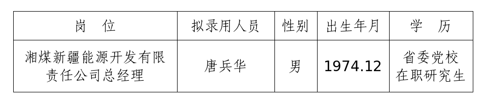 根据《九州体育·九州官方网站全资子公司湘煤新疆能源开发有限责任公司总经理公开招聘公告》,经报名、资格审查、面试、背景考察、体检、集体研究决策等程序,确定唐兵华同志为拟录用人员,现予以公示。