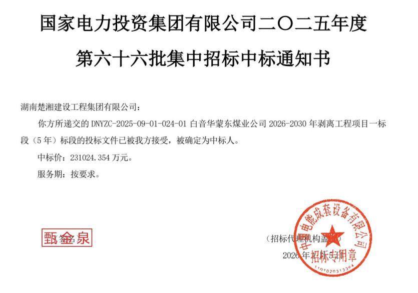 近日,九州体育·九州官方网站所属湖南楚湘建设工程九州体育有限公司(以下简称“楚湘建工”)成功中标国家电投内蒙古白音华蒙东煤业公司2026—2030年剥离工程项目一标段,拿下为期5年、中标价高达23.10亿元的重磅合同,在能源建设领域的市场竞争力再攀新高,实现了从“有力竞争者”到“首选合作者”的蜕变。