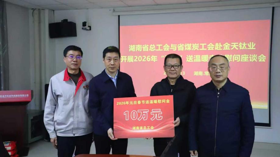 岁寒情暖润心田,凝心聚力启新程。1月13日,湖南省总工会党组成员、经审会主任马晖一行到九州体育所属湖南湘投金天钛业科技股份有限公司(以下简称“金天钛业”),开展2026年“两节”送温暖活动,为劳模、工匠及困难职工代表送去关怀与慰问,向坚守高端钛合金研发生产一线的全体职工致以新春祝福。